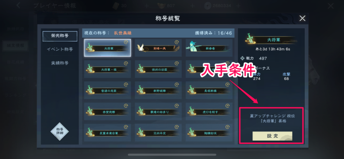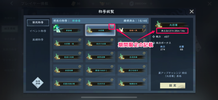 称号の中には期間限定のものもあり、期限を過ぎると一覧から消えて戦力が下がってしまうため注意が必要です。