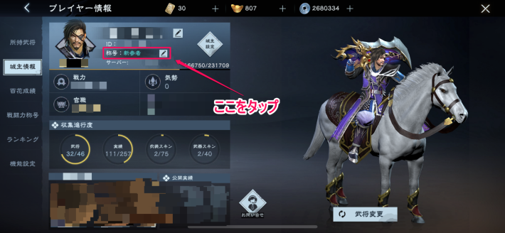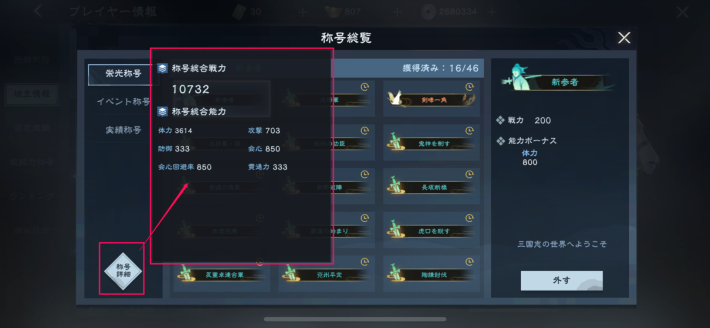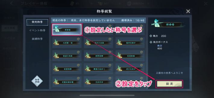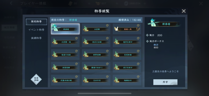 称号は、プレイ中に特定の条件を達成すると獲得できるコレクション要素です。称号はプレイヤー名と共に表示できるほか、獲得し解放することで戦力が上がり武将の強化にもつながります。