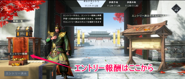 エントリー期間になるとギルド長のみエントリーの権限が与えられます。エントリーすると、ギルドメンバー全員がエントリー報酬を受け取れるので忘れずにGETしましょう。