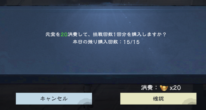 元宝を消費することで最大1日15回まで挑戦回数を増やせます。最後の追い込みをする時などにおすすめです。