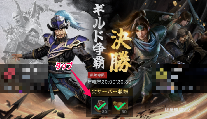 ギルド争覇戦の決勝が開始されると全サーバーに報酬が配布されます。ログイン時に出てくる画面をタップすることで受け取り可能です。