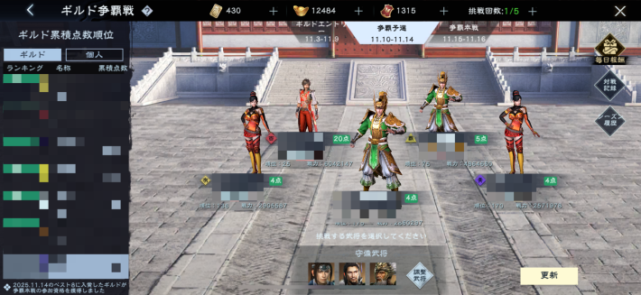 エントリーしたギルドは、翌週の月曜日から5日間のポスト争奪に参加できます。自身の戦力と対戦する相手の守備武将の戦力を比較し高い方が勝利します。自分より順位の高い相手に勝利することで順位が入れ替わります。