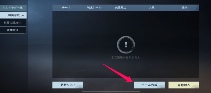 群英合戦でマッチングしないと感じたらチームを作成しましょう。チームを作成することでフレンドやギルドメンバー、おすすめのプレイヤーを招待できるようになるため、遊びやすくなります。