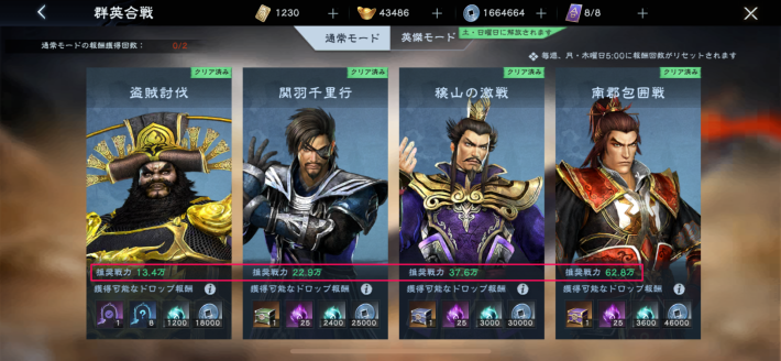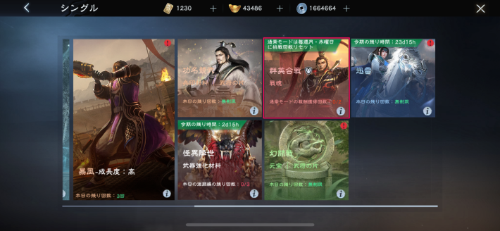 | 英傑モード | 群英合戦・英傑入場券を所持している場合、土日の開催時に参加可能 |