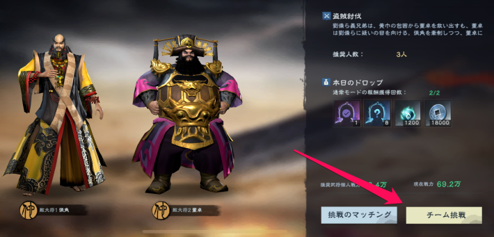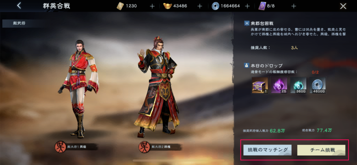 群英合戦は自分と他2人のプレイヤーとマッチングして、ボスを倒すマルチコンテンツです。通常モードと英傑モードの2種類がありそれぞれ参加方法が異なります。