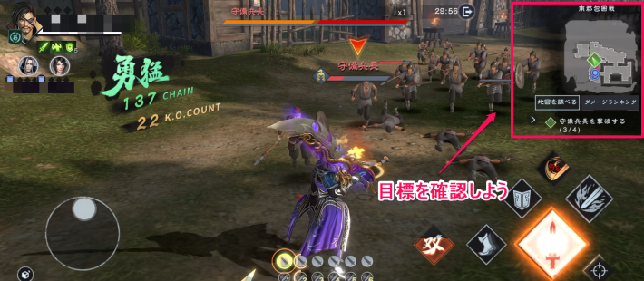 群英合戦の制限時間は30分で、ステージ構成は基本的に精鋭1→ボス1→精鋭2→ボス2→クリアの4つのステップに分けられます。画面右上のマップと目標をしっかり確認してクリアしていきましょう。