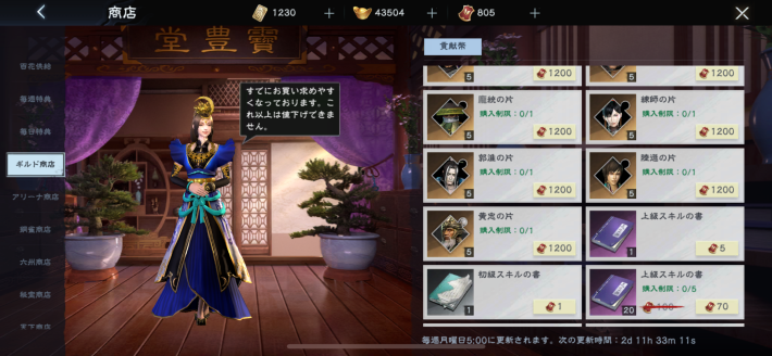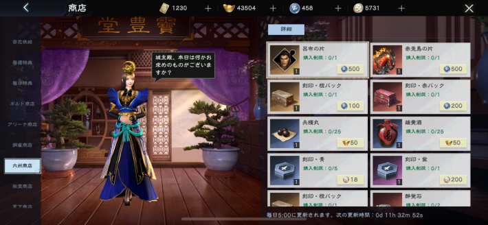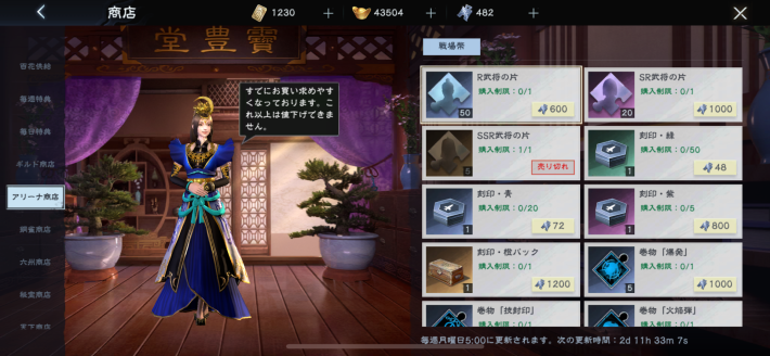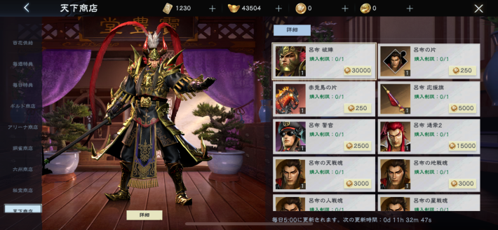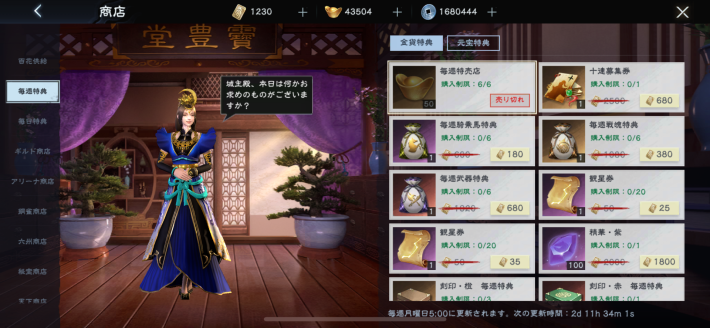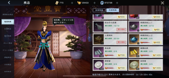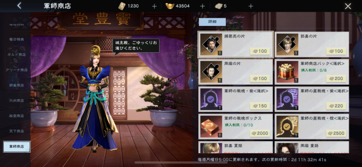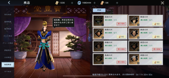 秘宝商店は、ガチャを回して入手した秘宝貨で武将の片を交換できます。毎週月曜日の5:00に品ぞろえが変わるので、交換したい片があった場合忘れず交換するようにしましょう。