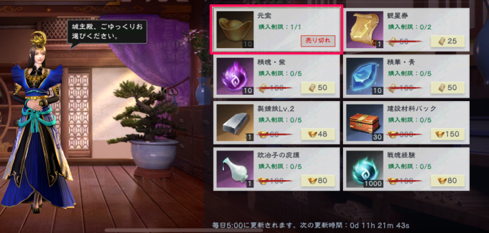 毎日商店では、毎日10元宝が無料で獲得できるので忘れずに交換しましょう。その他のアイテムの交換優先度は低いですが、武器強化アイテムの欧冶子の庇護は不足しがちなアイテムなのでおすすめです。