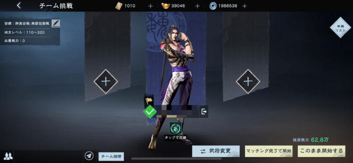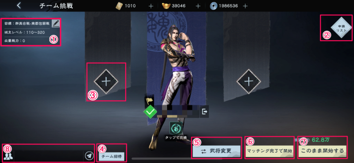 | ⑤武将変更 | ロビー画面下部の「武将変更」をタップすると、自分の使用する武将を変更できます。初期状態は一番戦力の高い武将が選択されています。必要であればパーティー内のほかの武将を見て、キャラを変更しましょう。 |