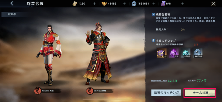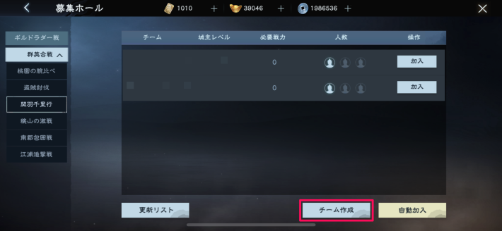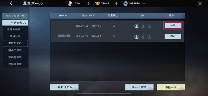 ロビーへ参加方法するには、まずプレイしたいコンテンツで「チーム挑戦」をタップ。その後プレーヤーが作成した「募集ホール」が表示されます。