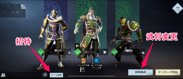 チームを作成する時は、左下の「チーム招待」からギルドメンバーを招待できます。自身が使用する武将を変更したい時は「部隊編成」をタップしましょう。