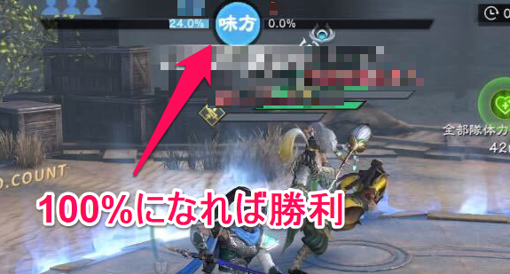 ギルドラダー戦では、マップ中央にある領地に敵チームよりも多くの武将が入ることで占領できます。占領することでゲージが進み、100%に達することで勝利となります。敵武将を領地から追い出してゲージを溜めましょう。