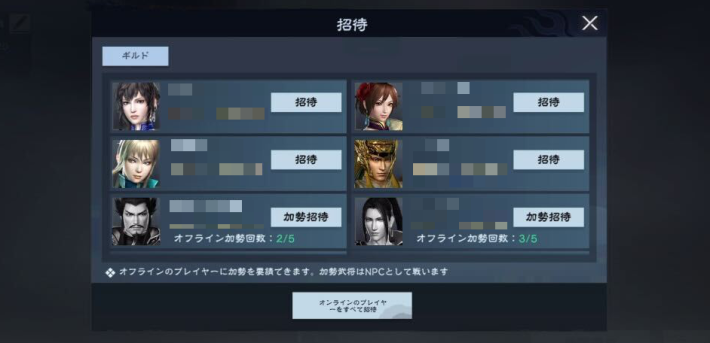 オフライン状態のメンバーでも1日に5回までNPC武将として招待可能です。参加できるメンバーが足りない時は招待しましょう。
