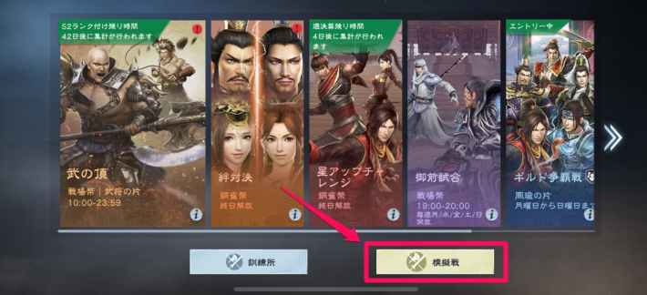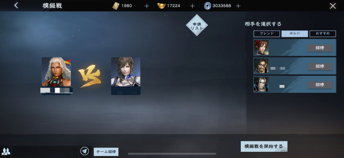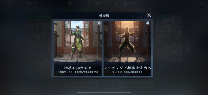 真・三國無双 覇の模擬戦とは、3人の武将同士でPvPができるコンテンツです。特定のプレイヤーかマッチングで相手を決めるかを選んで対戦可能です。武の頂や御前試合などの練習としておすすめです。