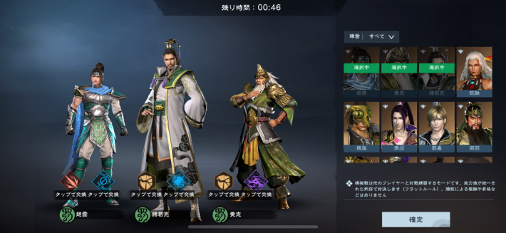 対戦相手が決まったら武将を3人選んで戦闘を開始しましょう。報酬や任務などはないため、練習したい武将を編成するのがおすすめです。