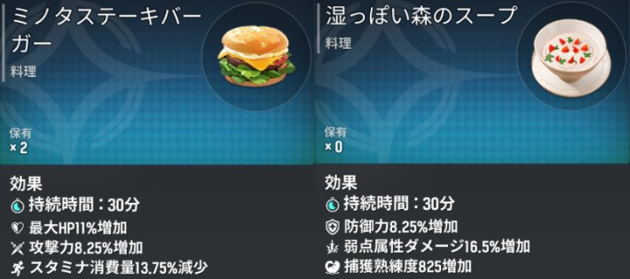 料理は一時的に操作キャラクターを強化する消費アイテムです。討伐での戦闘中も料理の効果は有効なので、クリアがギリギリの場合などに活用しましょう。
