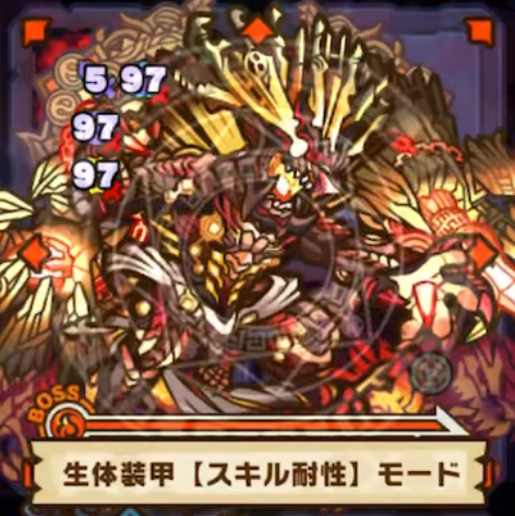 | ② | 生体装甲 【スキル耐性】 モード | ボスは2ターンの間物理・スキル反射、ブロック、スキルダメージ減衰、物理ダメージ増加状態 |