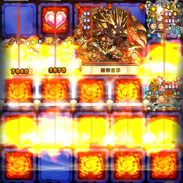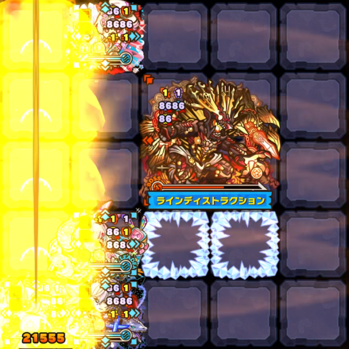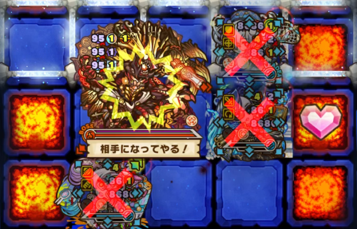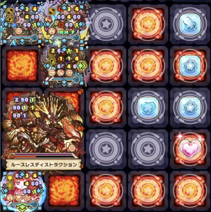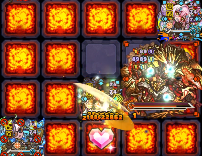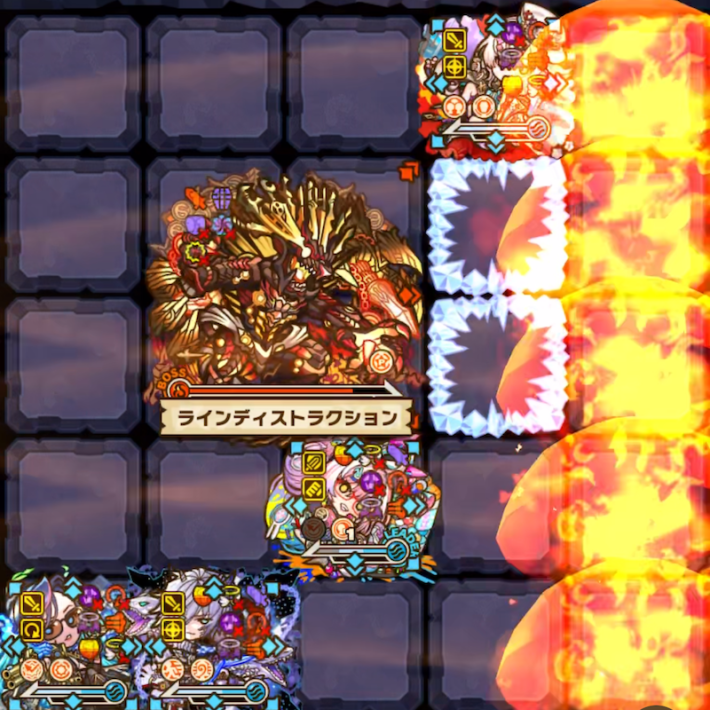 | 残HP50%以下 | プレイヤーを1回選択してスキルダメージ。縦横斜め全列に誘爆時ダメージ。盤面4ヶ所にランダムで溶岩マスを設置 |