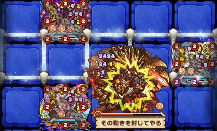 中ボスの通常攻撃は耐えられない威力だが、50ターンの間矢印攻撃不可状態なのでデバフ状態を維持していれば攻撃を受ける心配はない。そのため前エリアから矢印攻撃不可のオートデバフが残っている味方がいる場合は、通常攻撃を当ててターン数を上書きしないように注意。