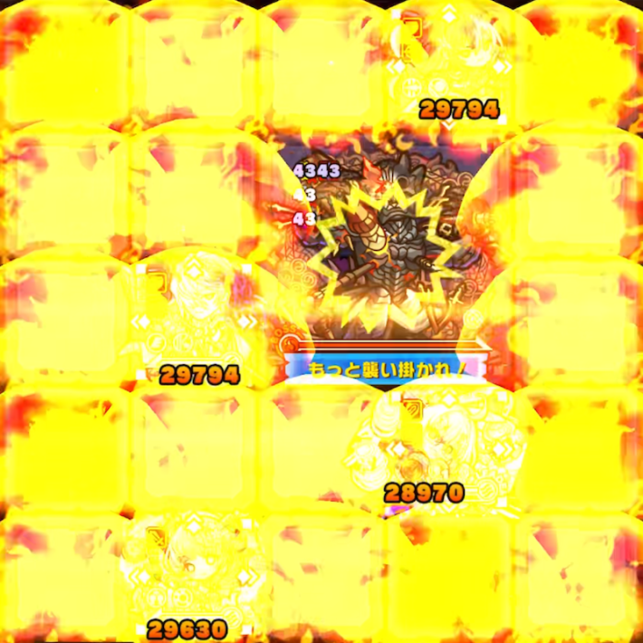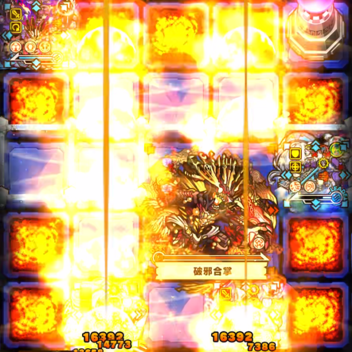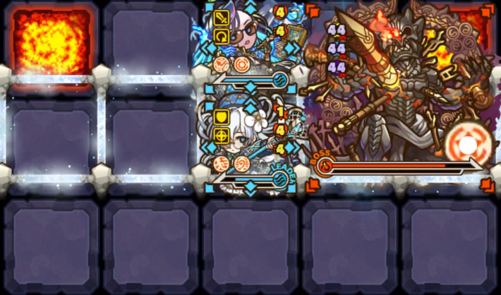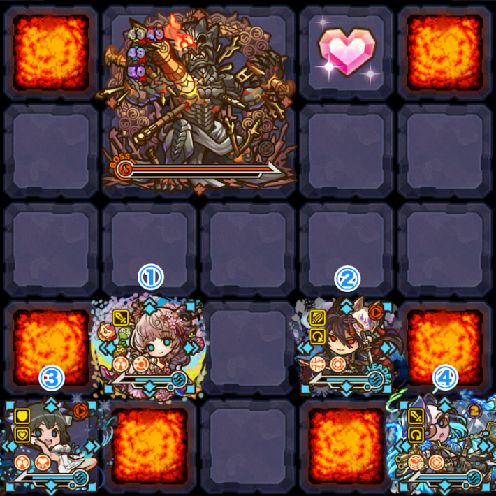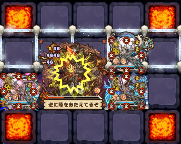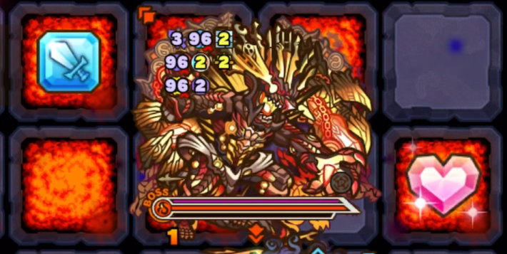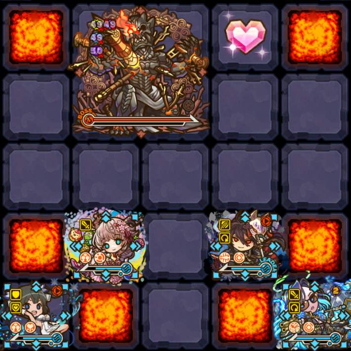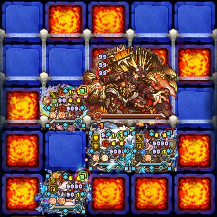 | 登場時 | ボスは99ターンの間、ダメージ増加/スキル使用不可/攻撃・スキル使用不可/反撃シールを付与。盤面8ヶ所にランダムで溶岩マスを設置 |