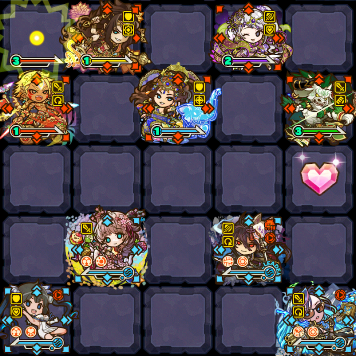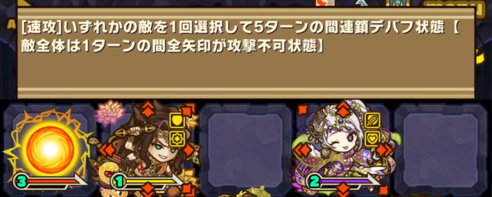 第2エリアでは左上の敵からは、矢印攻撃不可状態にできるオートデバフ効果を付与される。第3エリアで登場する中ボスは常に矢印攻撃不可状態のため、オートデバフ状態の味方で付与すると効果ターン数が上書きされるので接近は避けよう。