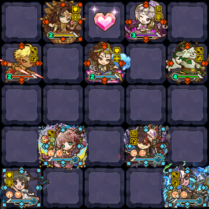 | ② | 周囲へ陽気が広がっていく | 1回目のスキル使用時、周囲マスに30000スキルダメージ。2回目のスキル使用時、二重周囲マスに30000スキルダメージ。3回目のスキル使用時、三重周囲マスに40000スキルダメージ。4回目以降のスキル使用時、全体に50000スキルダメージ。 |