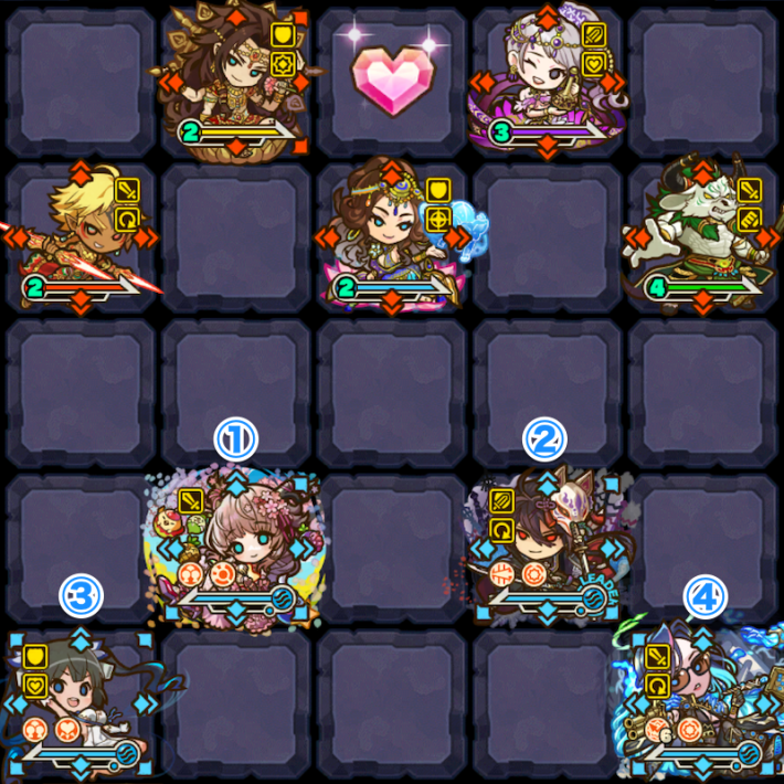 | ④ | 六方双縦 | 左から2・4番目の縦1列に強化効果を解除&連続防護貫通スキルダメージ |