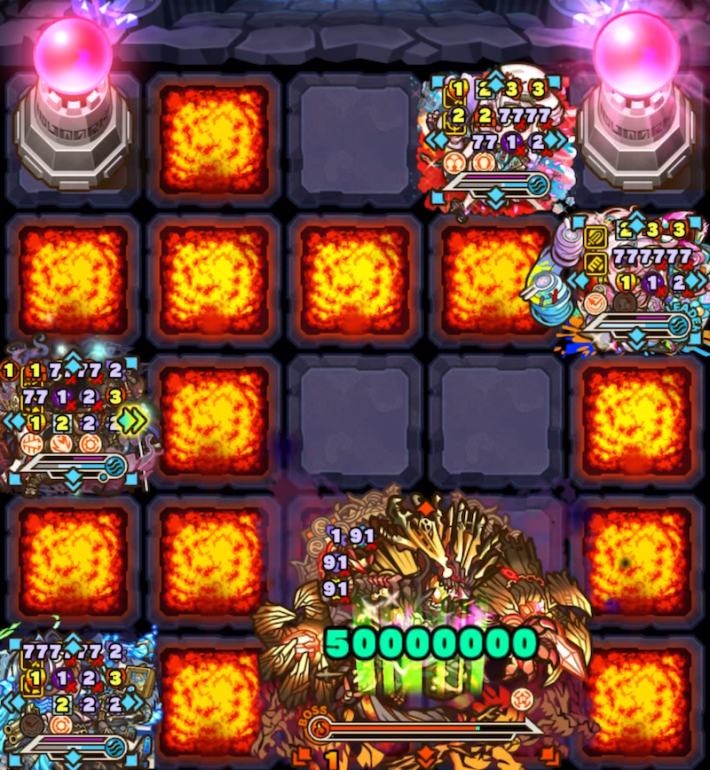 ボスは溶岩マスを設置してくるが、進化後が登場すると設置面積が増えてしまう。溶岩マスに乗り続けると被ダメージが倍増していくので、耐久するために適してスキルを用意しておこう。