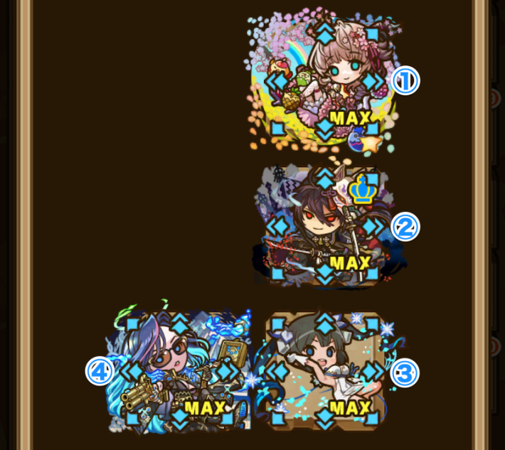 溶岩マス対策として、ダメージ無効を継続的に付与できるアニバ桜姫を採用。またHP回復や攻撃力ダウンを行えるヘスティアを入れているが、回復に関しては他のキャラでも代用が可能。ボス戦ではダメージ増加の種類に合わせて、クロトビを物理かスキルダメージ連鎖追撃を切り替えて攻撃している。
