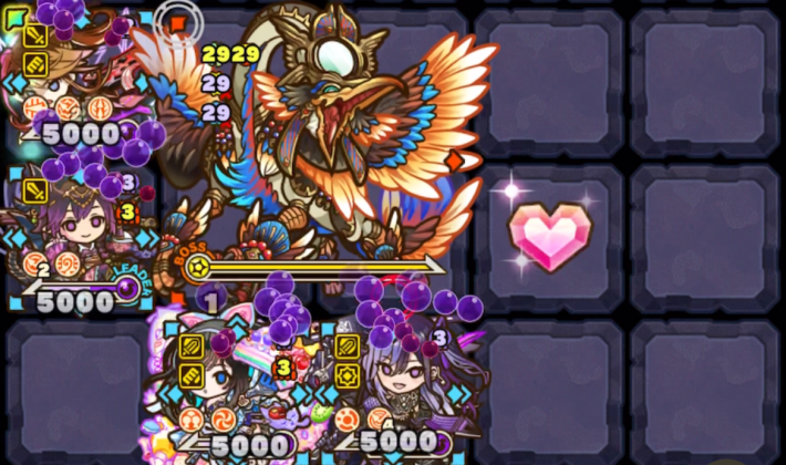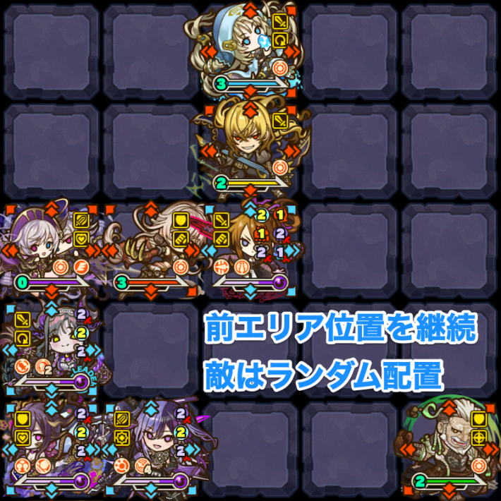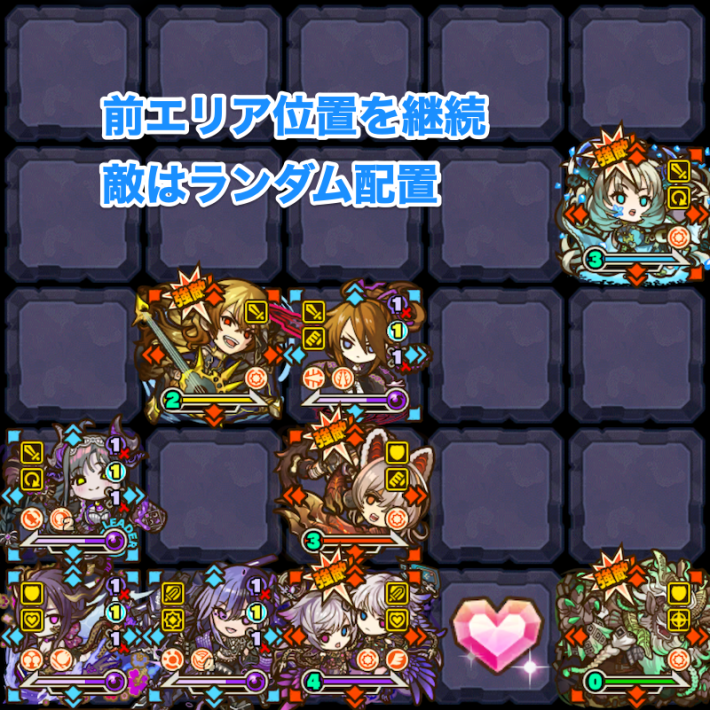 道中の攻略難易度は低い方だが、第3エリアに関しては敵の攻撃力が高い点には注意しよう。開幕で木属性の敵が攻撃・スキル使用不可を付与してくるので、1ターン目でスキルを発動できない場合は囲まないように上手く配置を調整しよう。