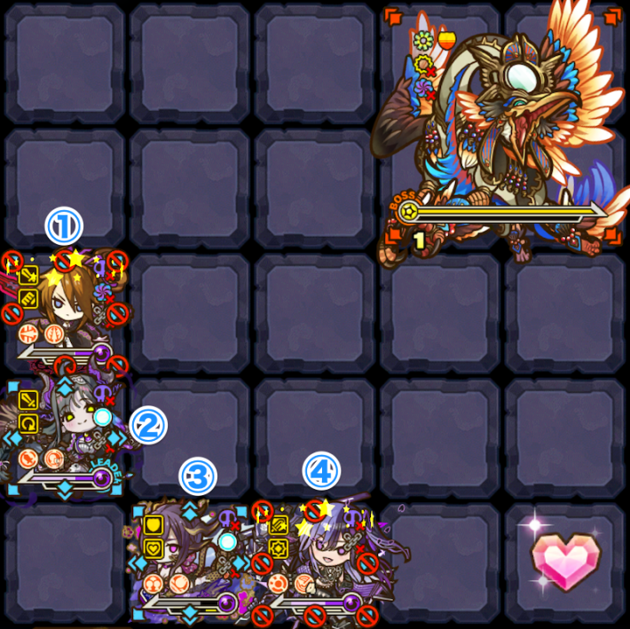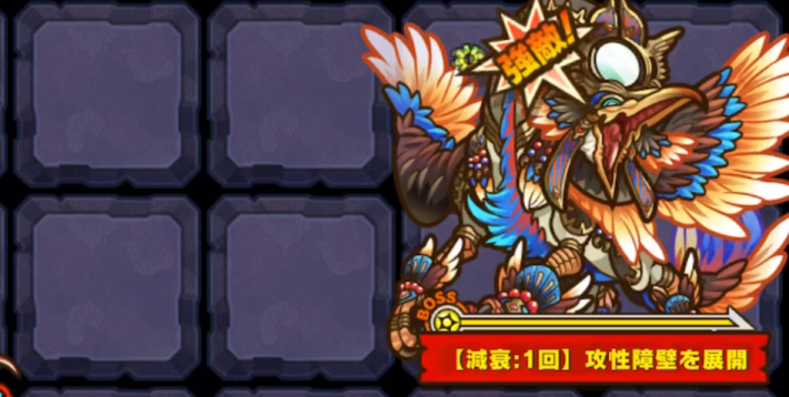 ④ | 二方霊撃 | ボスの縦2列以外の範囲に3ターンの間、攻撃力ダウン。ボスは1ターンの間攻撃力アップ(上下矢印時) ボスの横2列以外の範囲に3ターンの間、攻撃力ダウン。ボスは1ターンの間攻撃力アップ(左右矢印時) |