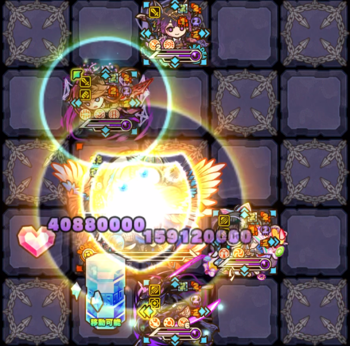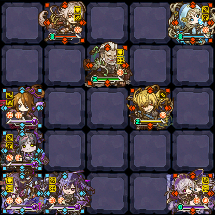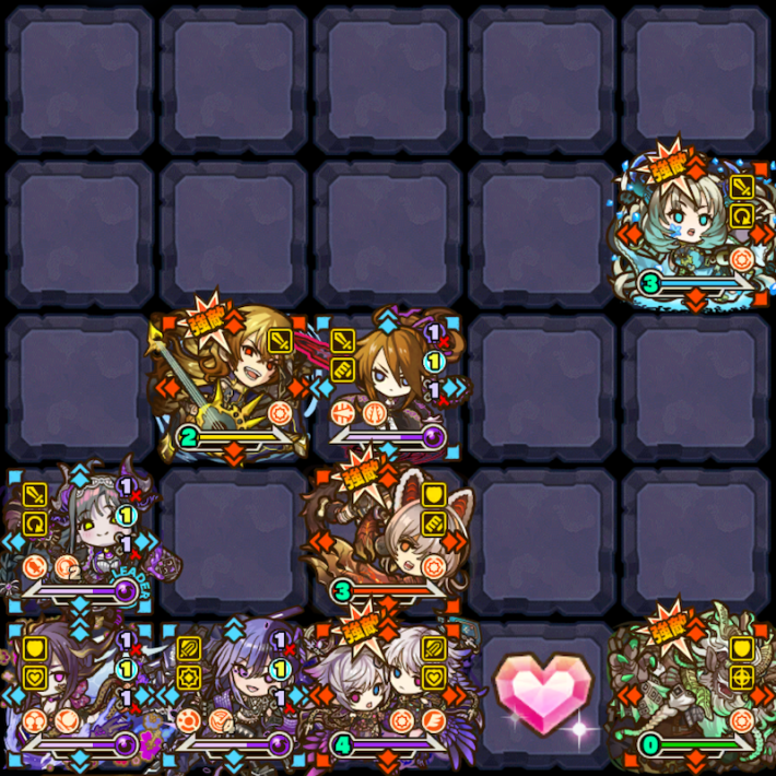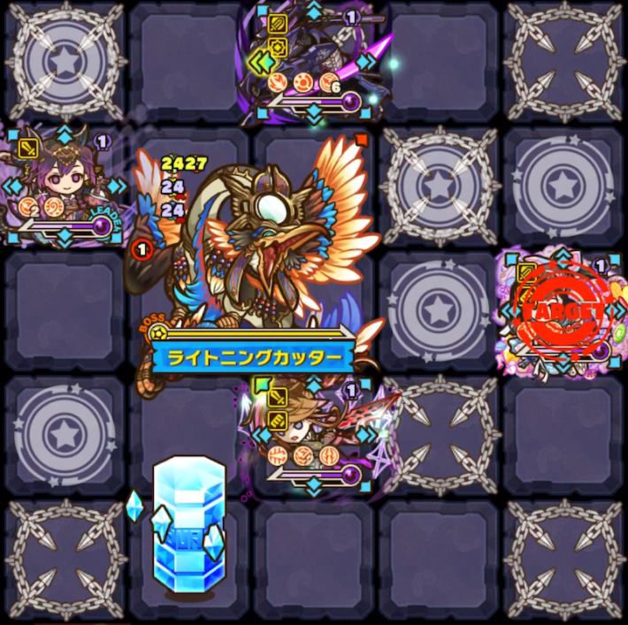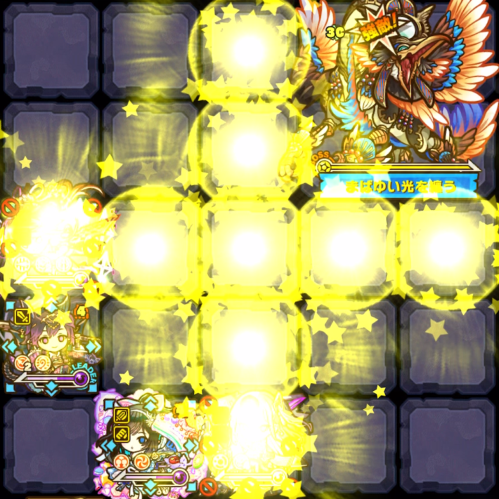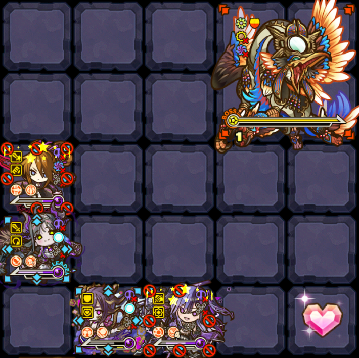 通常のスキルでは3ターンおきに、盤面固定十字列に対してスタンダメージと3ターン増加を行ってくる。スタンダメージ軽減ソウルを装備していてもターン減少は回避したいので、固定十字列範囲外で立ち回ろう。