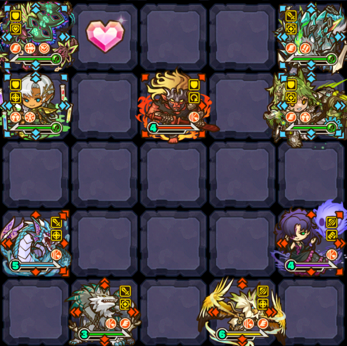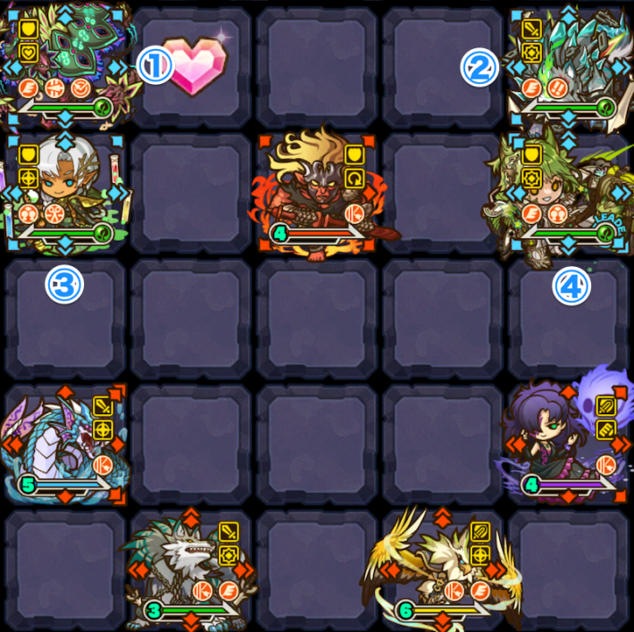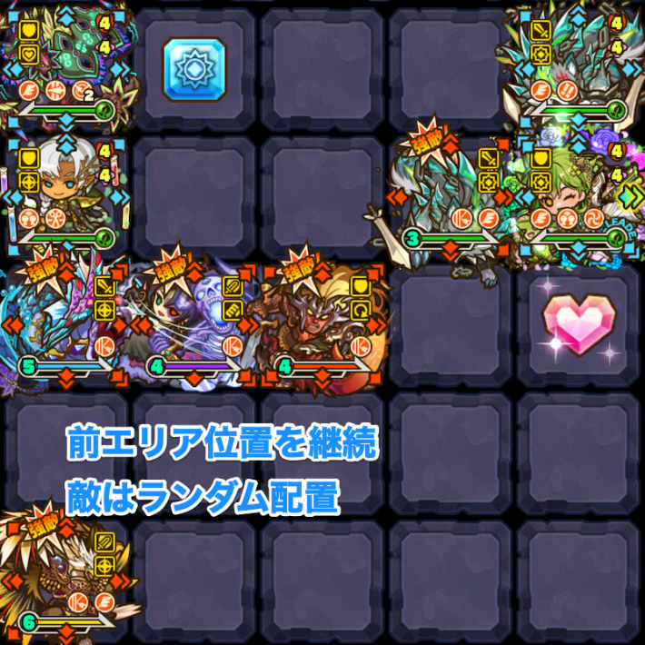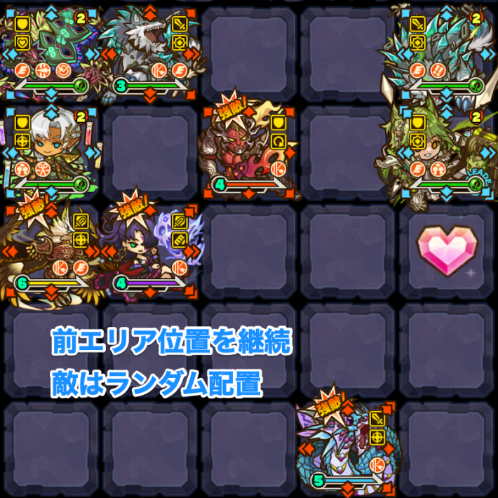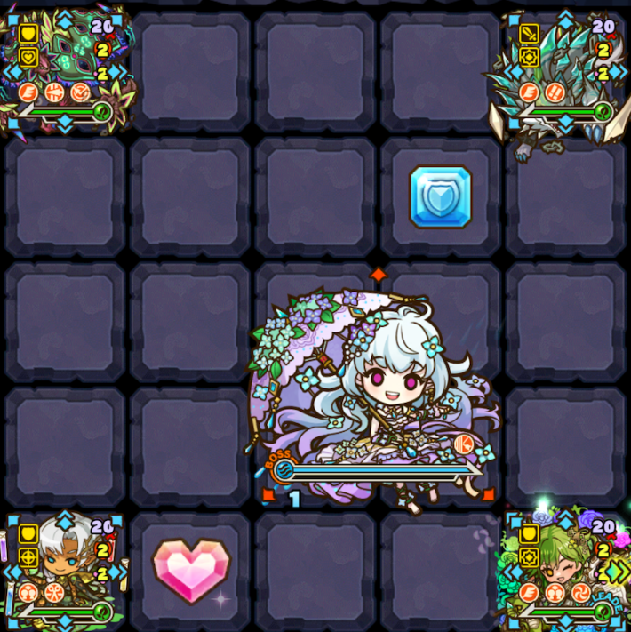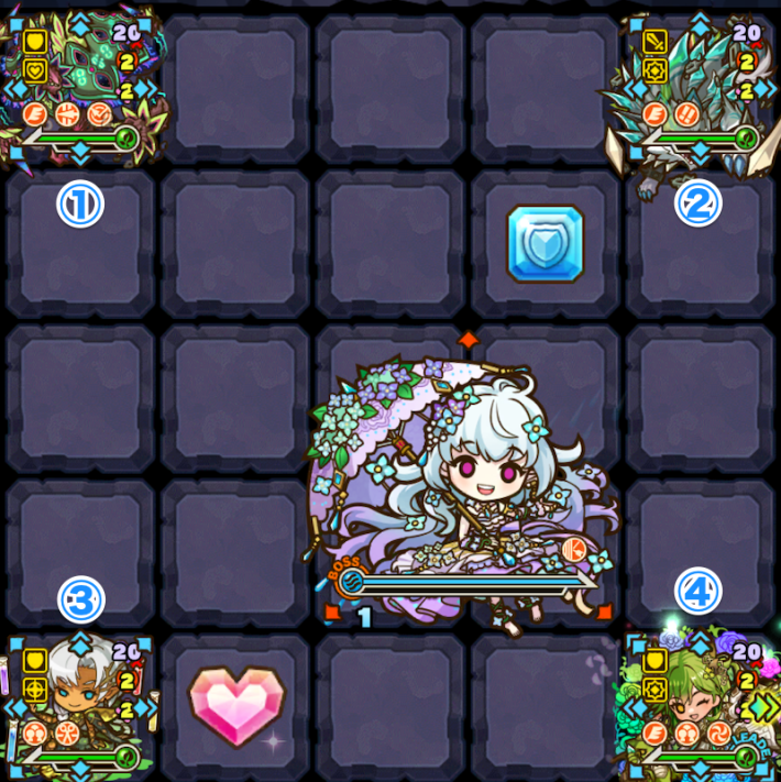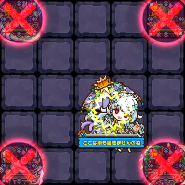 ② | 四方水溜り | 盤面左上から1マスおきに水属性ダメージトラップを設置&プレイヤーに1ターンの間スキル使用不可 |