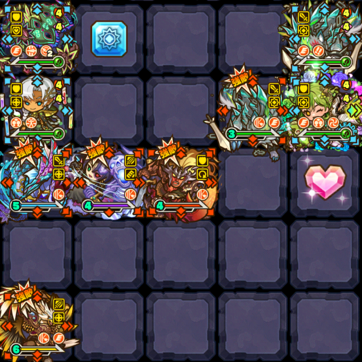 ① | 三方飛沫 | 上2マス・左下1マス・右下1マスにスキルダメージ 下2マス・左上1マス・右下1マスにスキルダメージ 右2マス・左上1マス・左下1マスにスキルダメージ 左2マス・右上1マス・右下1マスにスキルダメージ (矢印方向に攻撃) |