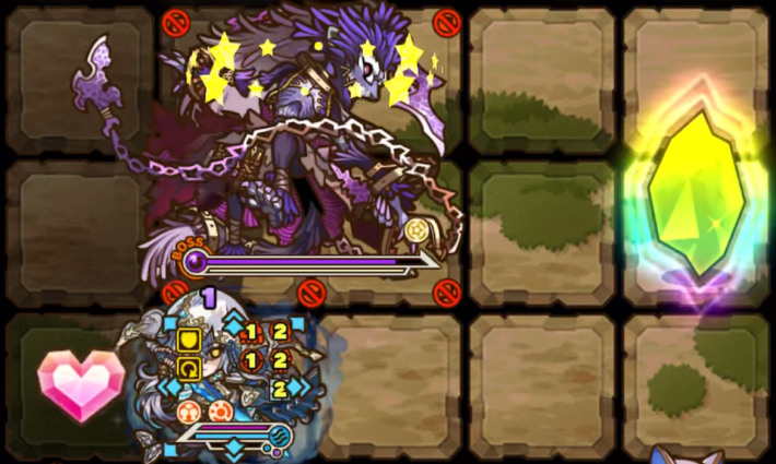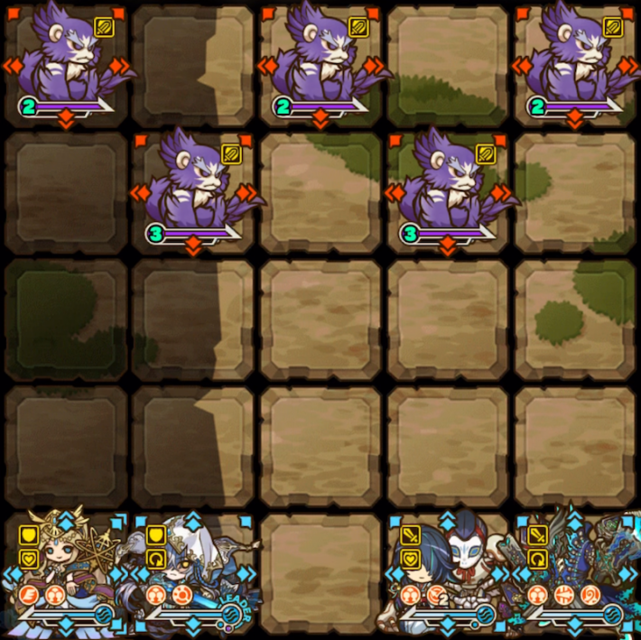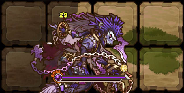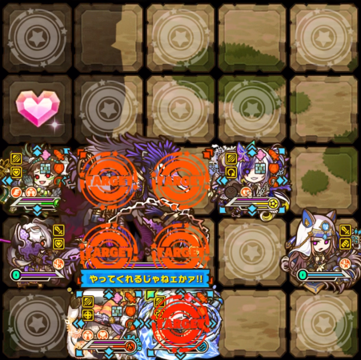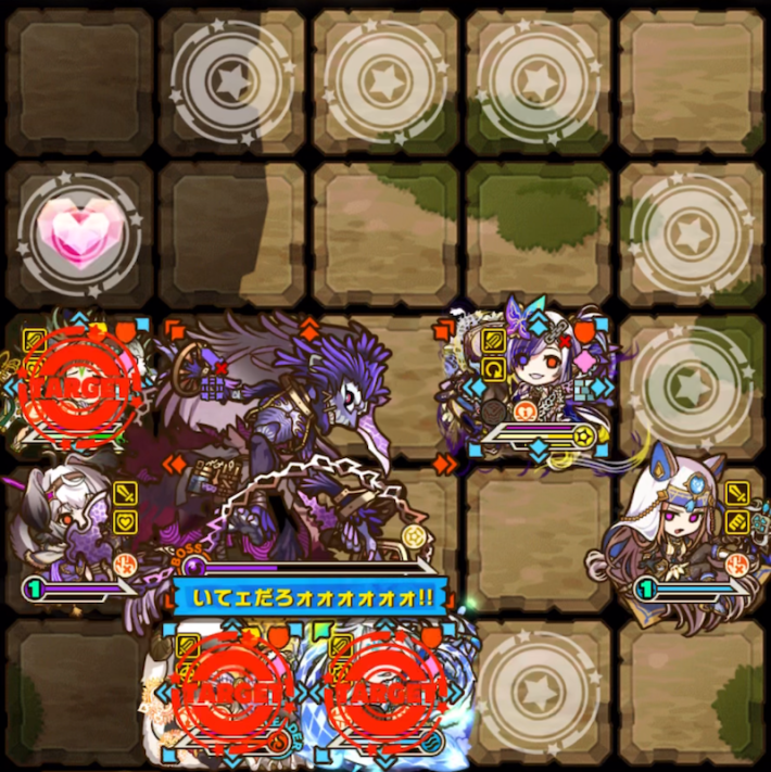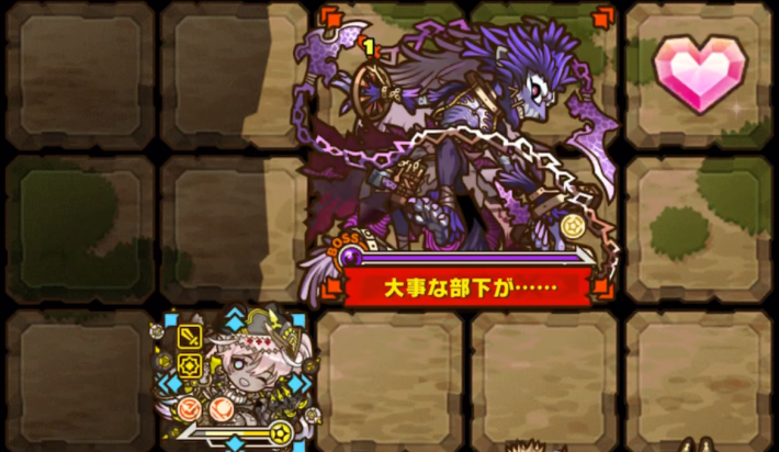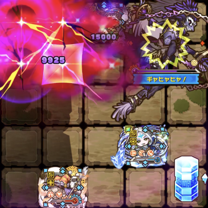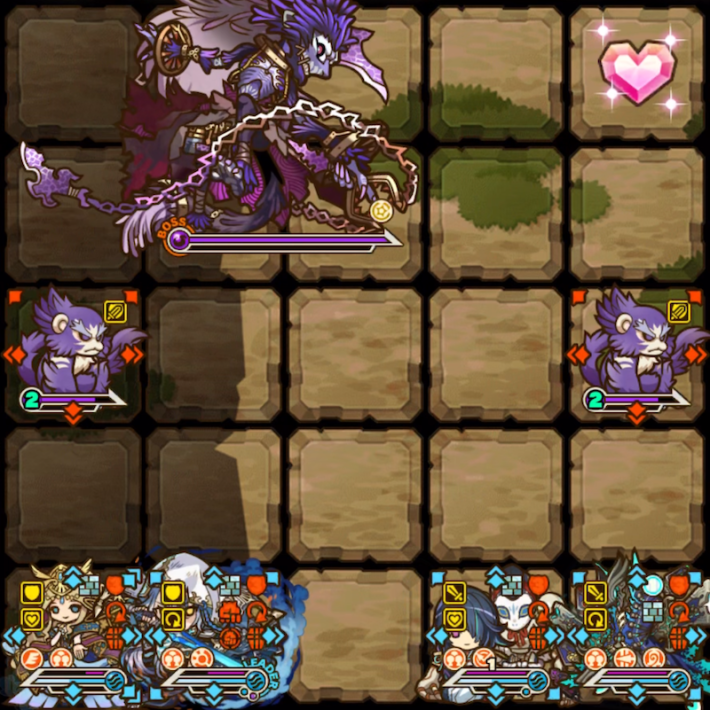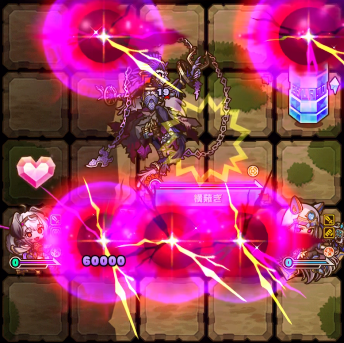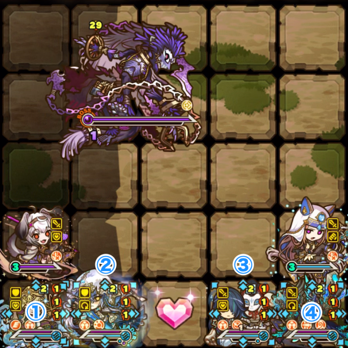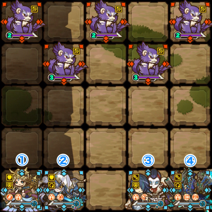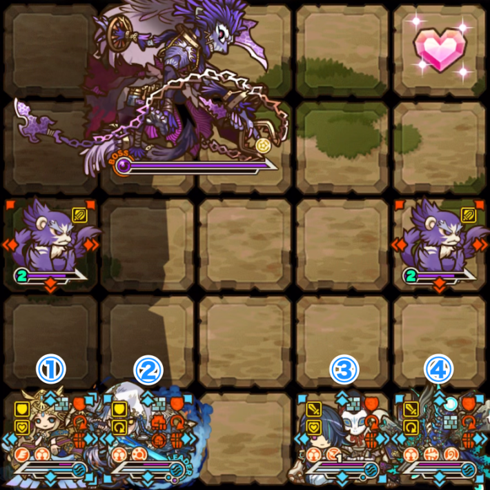 | ③ | 二方閃鞭 | 中ボスより上2列に15000スキルダメージ 中ボスより下2列に15000スキルダメージ 中ボスより右2列に15000スキルダメージ 中ボスより左2列に15000スキルダメージ (二重矢印方向に攻撃) |