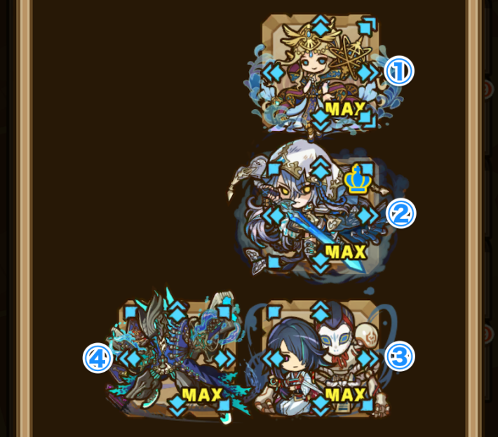 | ① | 四方薙鞭 | 上4マスに12000スキルダメージ 下4マスに12000スキルダメージ 右4マスに12000スキルダメージ 左4マスに12000スキルダメージ (三方向矢印方向に攻撃) |