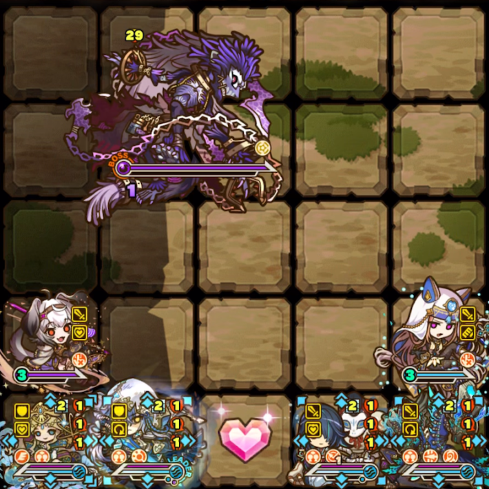 | 28コンボ以上で攻撃(1回目) | プレイヤーを4回選択してスキルダメージ。斜め4マス誘爆時に防護貫通スキルダメージ。3ターンの間ダメージ増加を付与 |