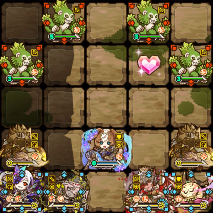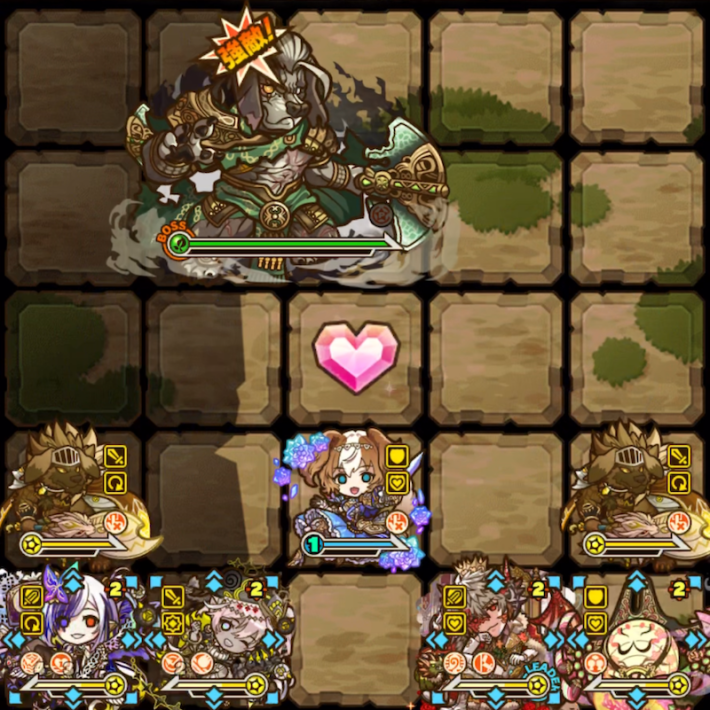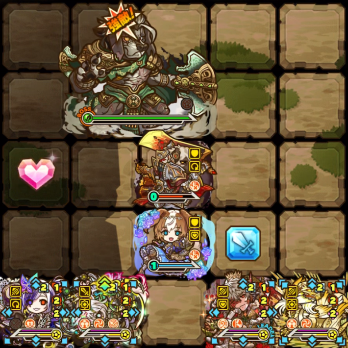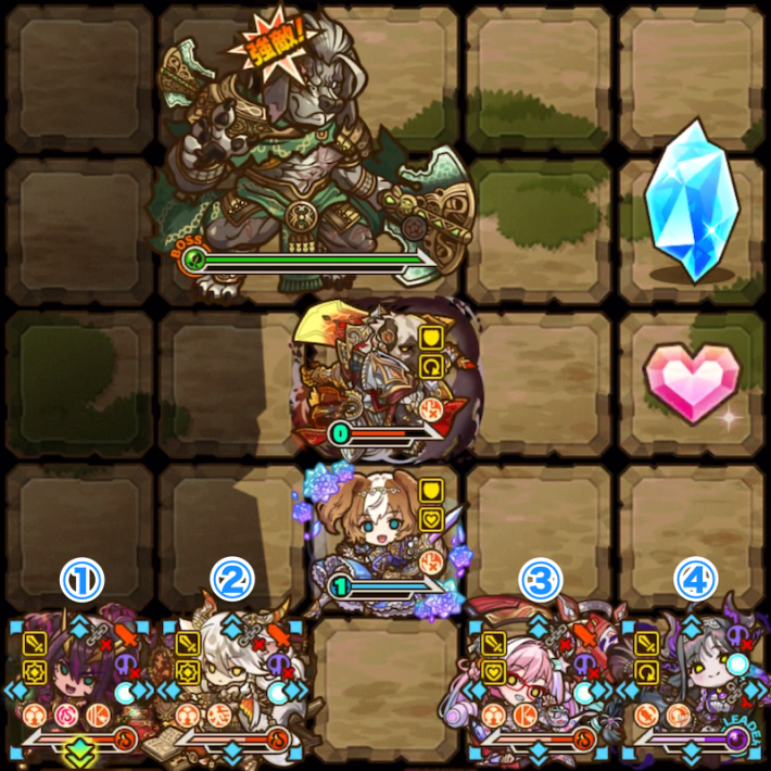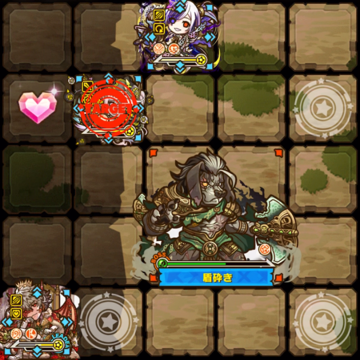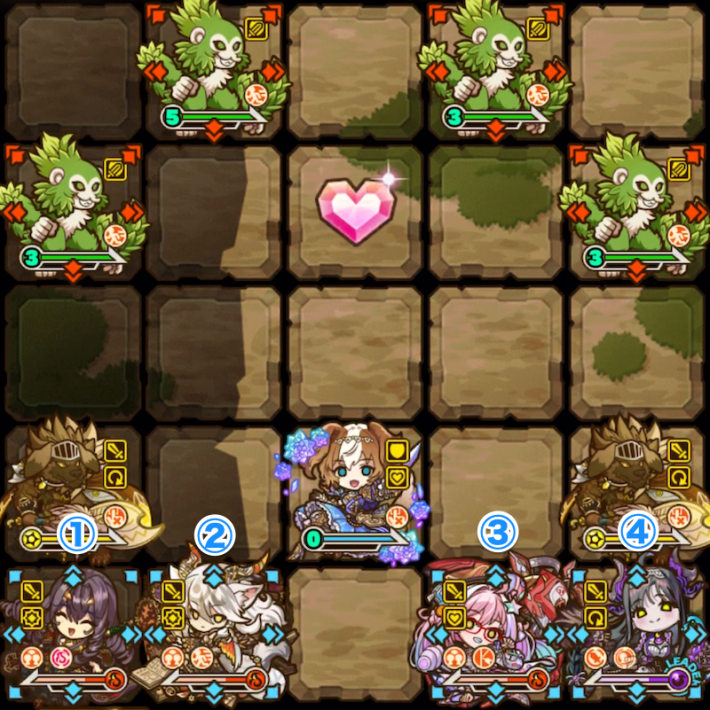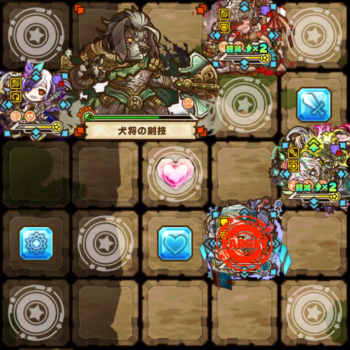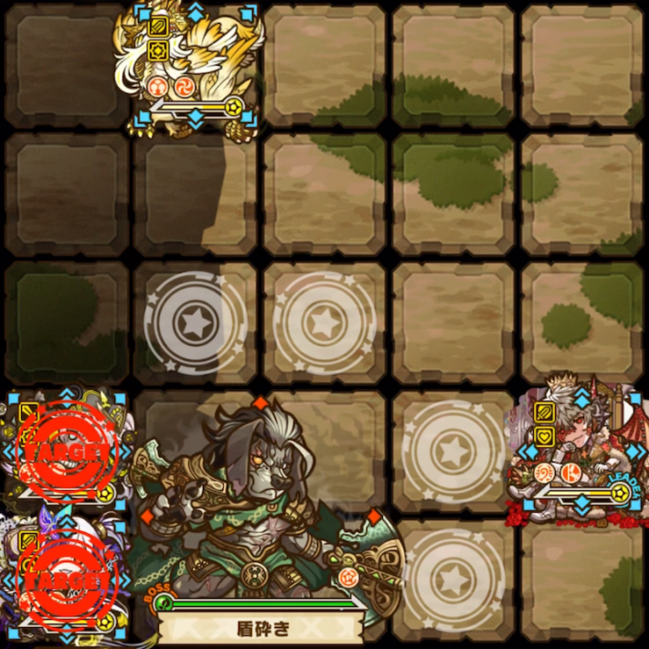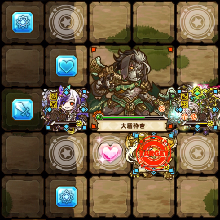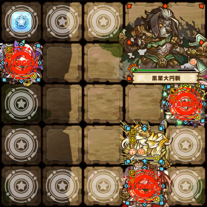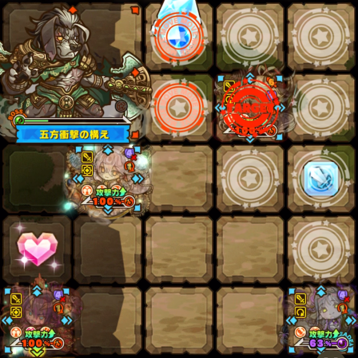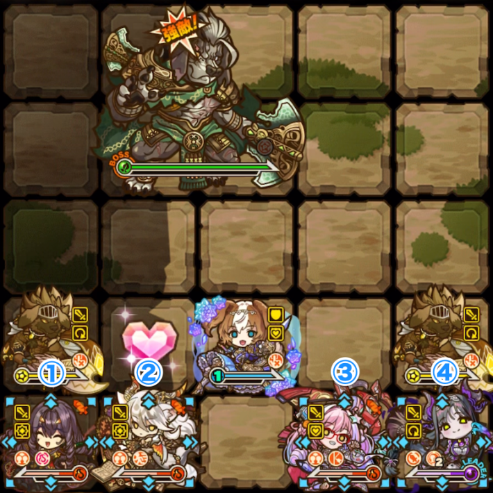 | ① | 五方斬破 | 上4マス&斜め4マスにノックバック+75000バリア破壊スキルダメージ 下4マス&斜め4マスにノックバック+75000バリア破壊スキルダメージ 右4マス&斜め4マスにノックバック+75000バリア破壊スキルダメージ 左4マス&斜め4マスにノックバック+75000バリア破壊スキルダメージ (矢印方向に攻撃) |
