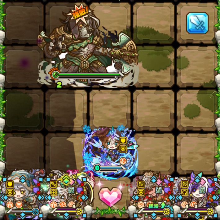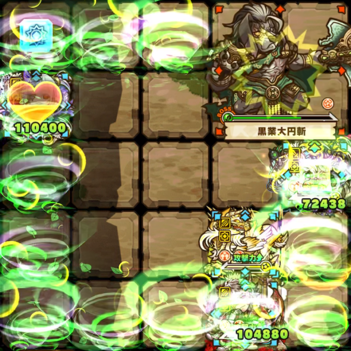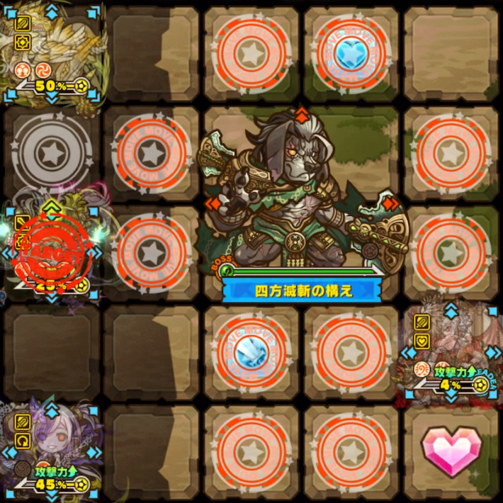 「全方背斬」の構え後のスキルでは、外周に対して12万の復活不能ダメージ。「四方会心」の構え後には盤面固定十字列または斜め全列に対して強力な復活不能ダメージを打ってくる。復活が効かないため、ダメージ無効で耐えるか、盤面移動やスキル使用不可で対処しよう。