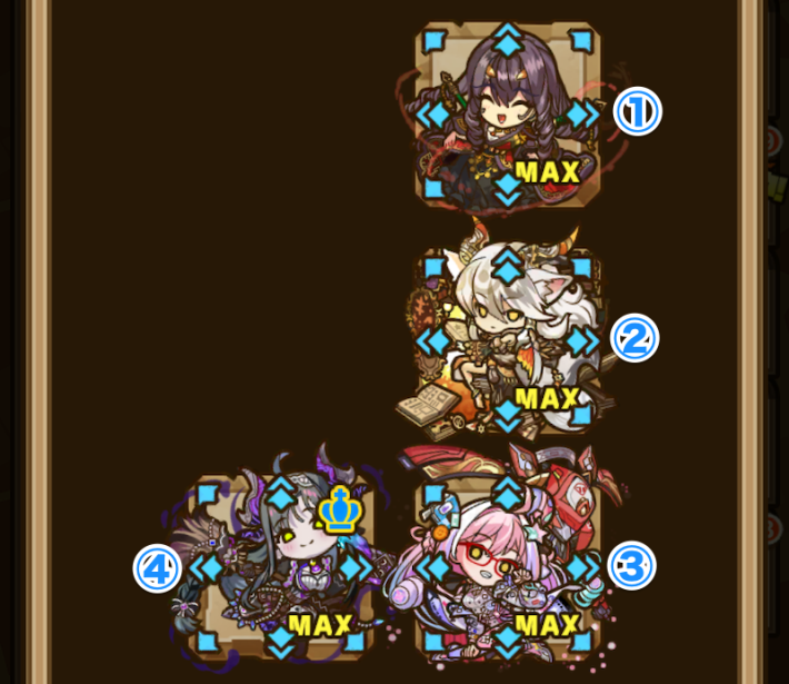 | ⑤ | 五方斬破 | 上4マス&斜め4マスにノックバック+75000バリア破壊スキルダメージ 下4マス&斜め4マスにノックバック+75000バリア破壊スキルダメージ 右4マス&斜め4マスにノックバック+75000バリア破壊スキルダメージ 左4マス&斜め4マスにノックバック+75000バリア破壊スキルダメージ (矢印方向に攻撃) |