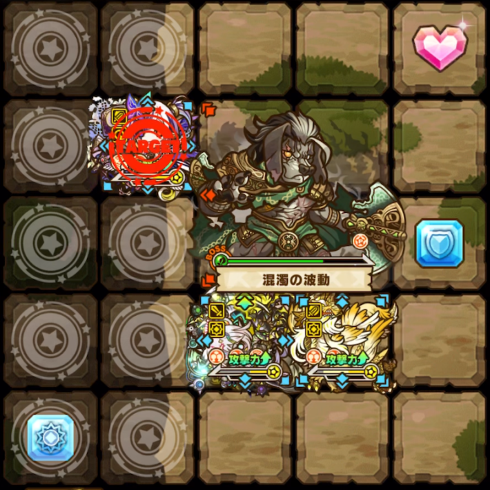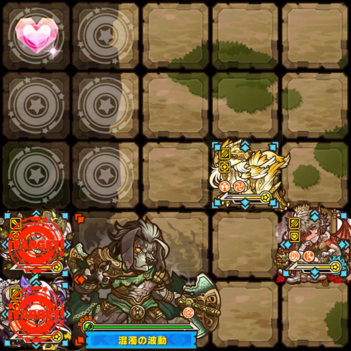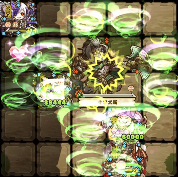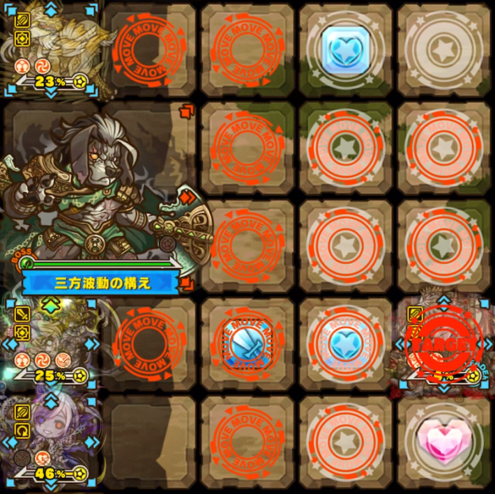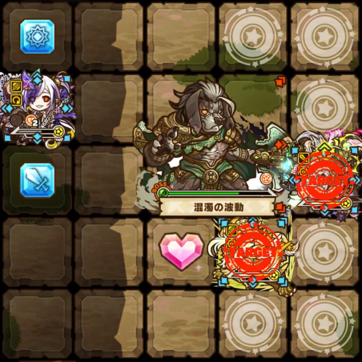 | ② | 三方波動 | 盤面固定で右から1〜2番目の縦列に60000スキルダメージ(右矢印時) 盤面固定で左から1〜2番目の縦列に60000スキルダメージ(左矢印時) |