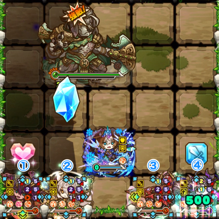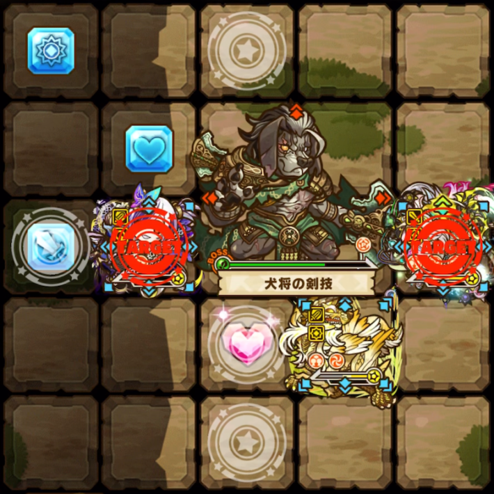 | ④ | 四方会心 | 盤面固定十字列に復活不能スキルダメージ(十字矢印時) 盤面固定斜め全列に復活不能スキルダメージ(斜め矢印時) |