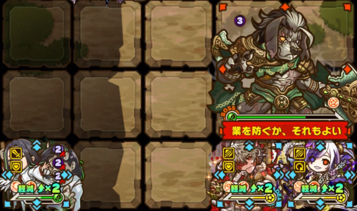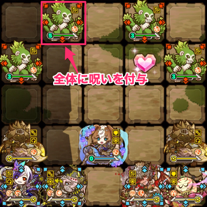 ボス戦では強力な呪いを繰り返し付与されるが、攻撃倍率の無いリーダースキルでも耐えられないほど威力が高い。そのため呪いシールで無効化するか、打ち消しで対抗しよう。