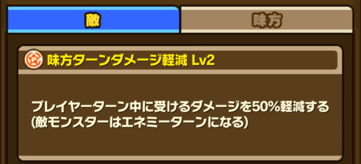 プレイヤーがシール状態になると、こちらに5ターンの間ダメージ%シールを付与してくる。軽減スキルを採用している編成以外では気になる効果では無いため、攻撃を受けたくないターンで一度だけ誘発させる使い方も効果的。