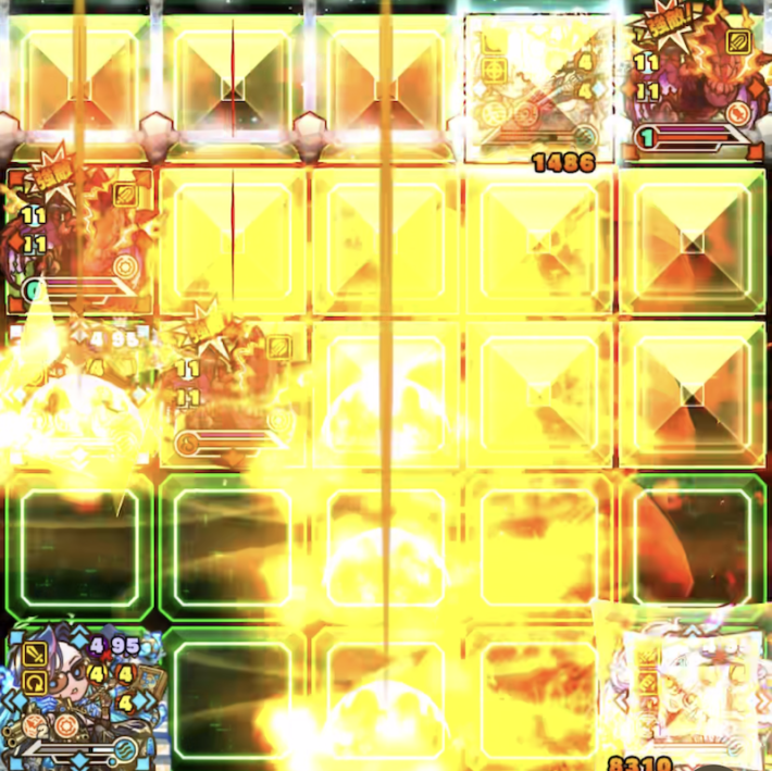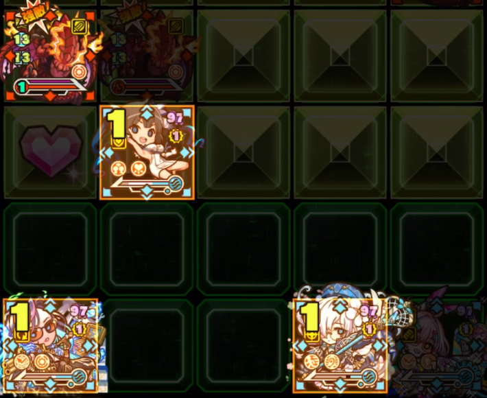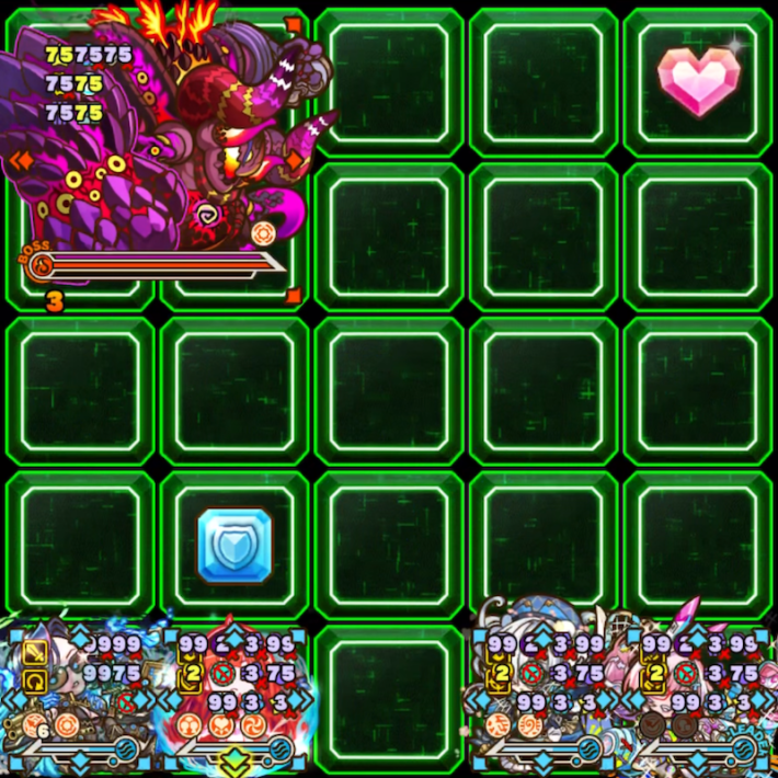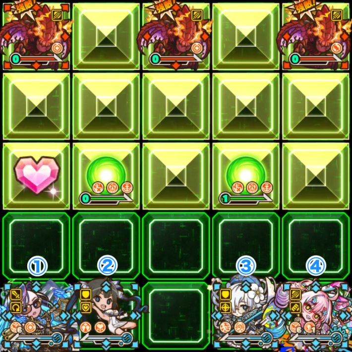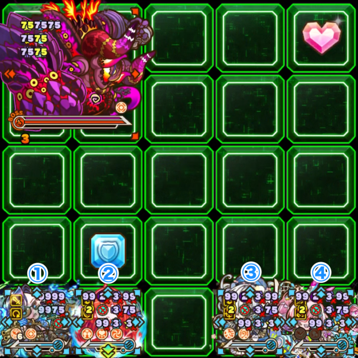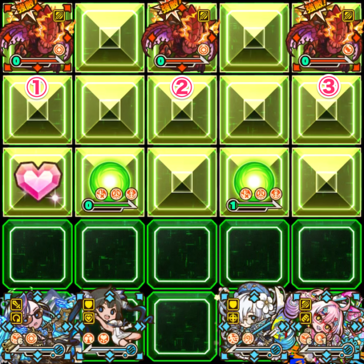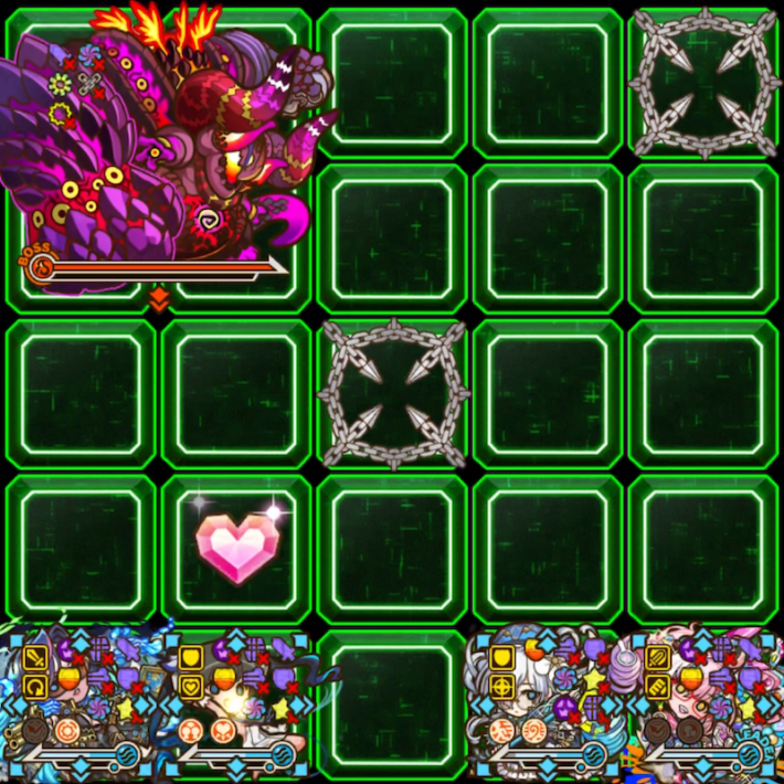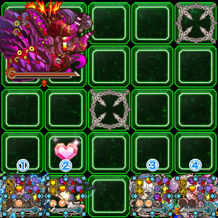 左上にいる敵は縦横斜め全列範囲内のプレイヤーに最大HP20%減少を行うので、ターゲットにされるキャラが少ないとHP40%〜60%減少を受けてしまう。敵と味方の配置を気にしつつ、小まめに全体化持ちでハートを回収して回復しよう。