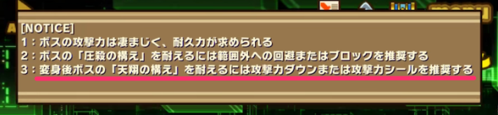 変身後ボスの特定の構え後には攻撃ダウンや攻撃力シールが有効とのこと。直前に攻撃力アップを発動した上で攻撃を仕掛けてくると予想されるため、火力を抑えるためのデバフやシール持ちが必要のようだ。