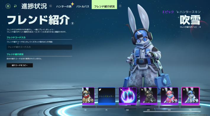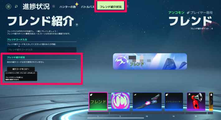 SUPERVIVEの紹介コードは、ロビーの進捗状況からフレンド紹介状況に移動すると入力画面に移動できます。