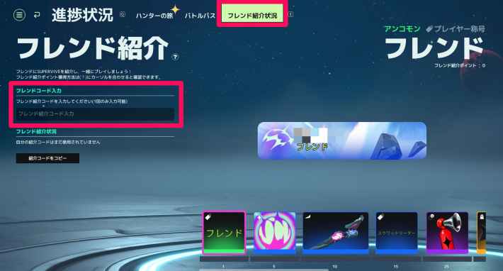 自分の紹介コードは、ロビーの進捗状況からフレンド紹介状況に移動するとコピーできます。コピーした紹介コードを「ctrl+V」などでペーストしてフレンドに送りましょう。