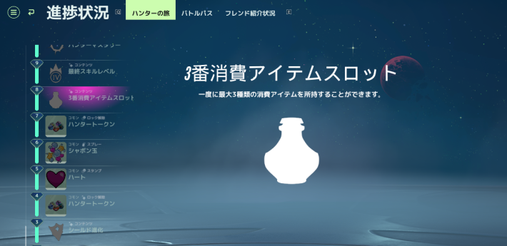 | 3番消費アイテムスロット | ハンターの旅レベル8で解放 |