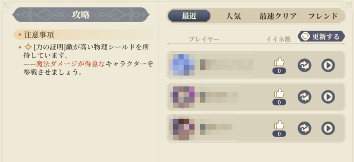 用意された注意事項とユーザーの攻略動画をゲーム内で確認できます。ステージ毎に閲覧できるため、攻略に行き詰まったら是非確認しましょう。